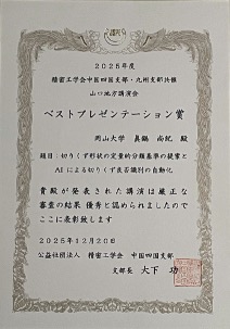 応用固体力学研究室岡田亜美さんが日本塑性加工学会中国・四国支部第2回支部講演会で優秀プレゼンテーション賞を受賞!