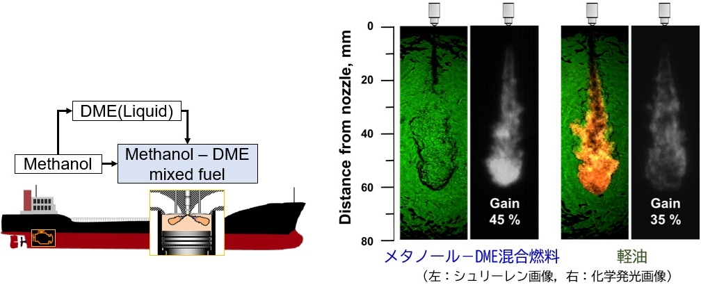 を解明しました.加えて,分子中に酸素原子を高い割合で含むメタノール-DME混合燃料の燃焼特性は,一般的な炭化水素燃料(軽油)と異なることも明らかにしました.