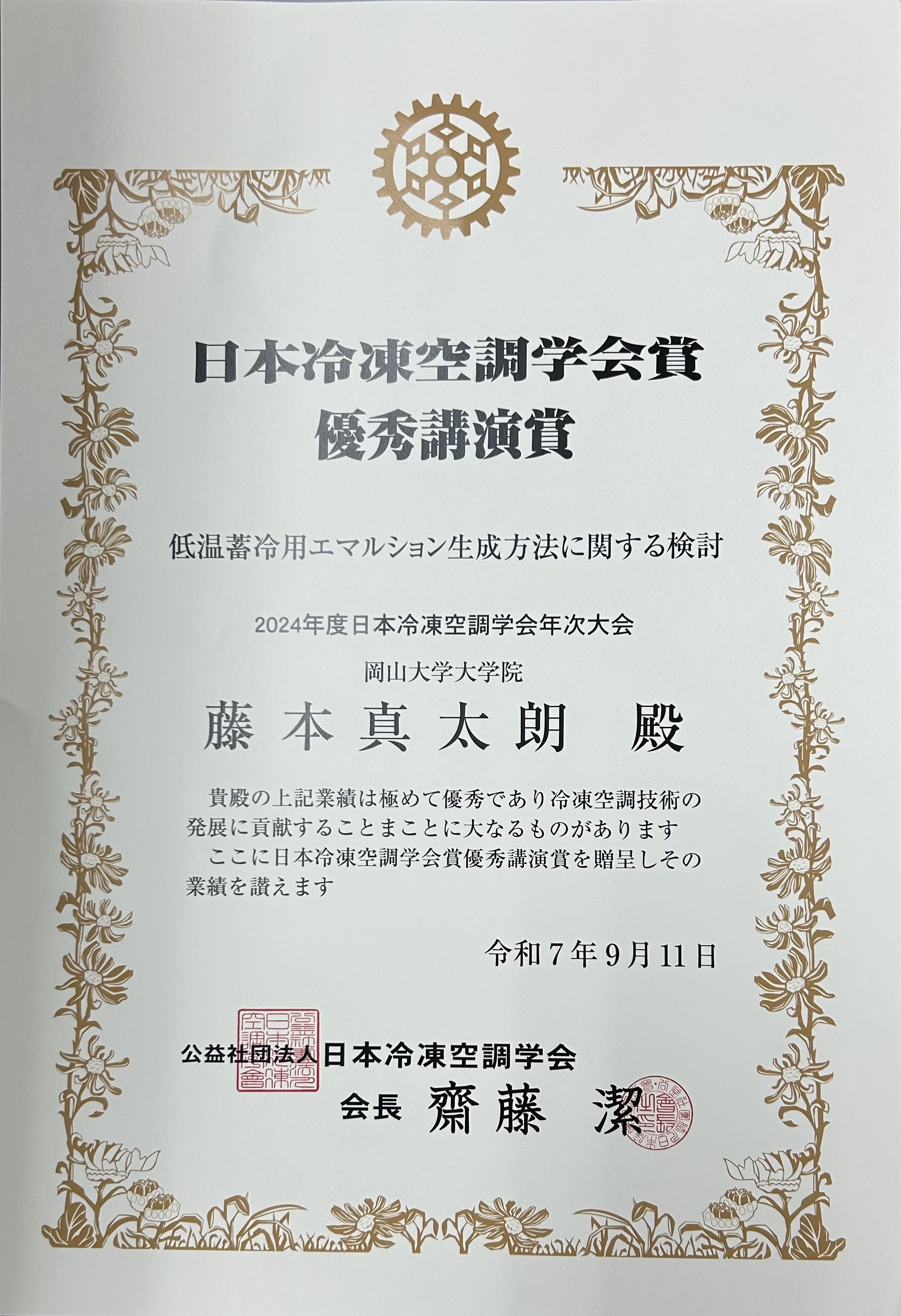 藤本真太朗さんが,2024年度日本冷凍空調学会年次大会(2024年9月4日~6日)において研究発表を行い,優秀講演賞を受賞しました.