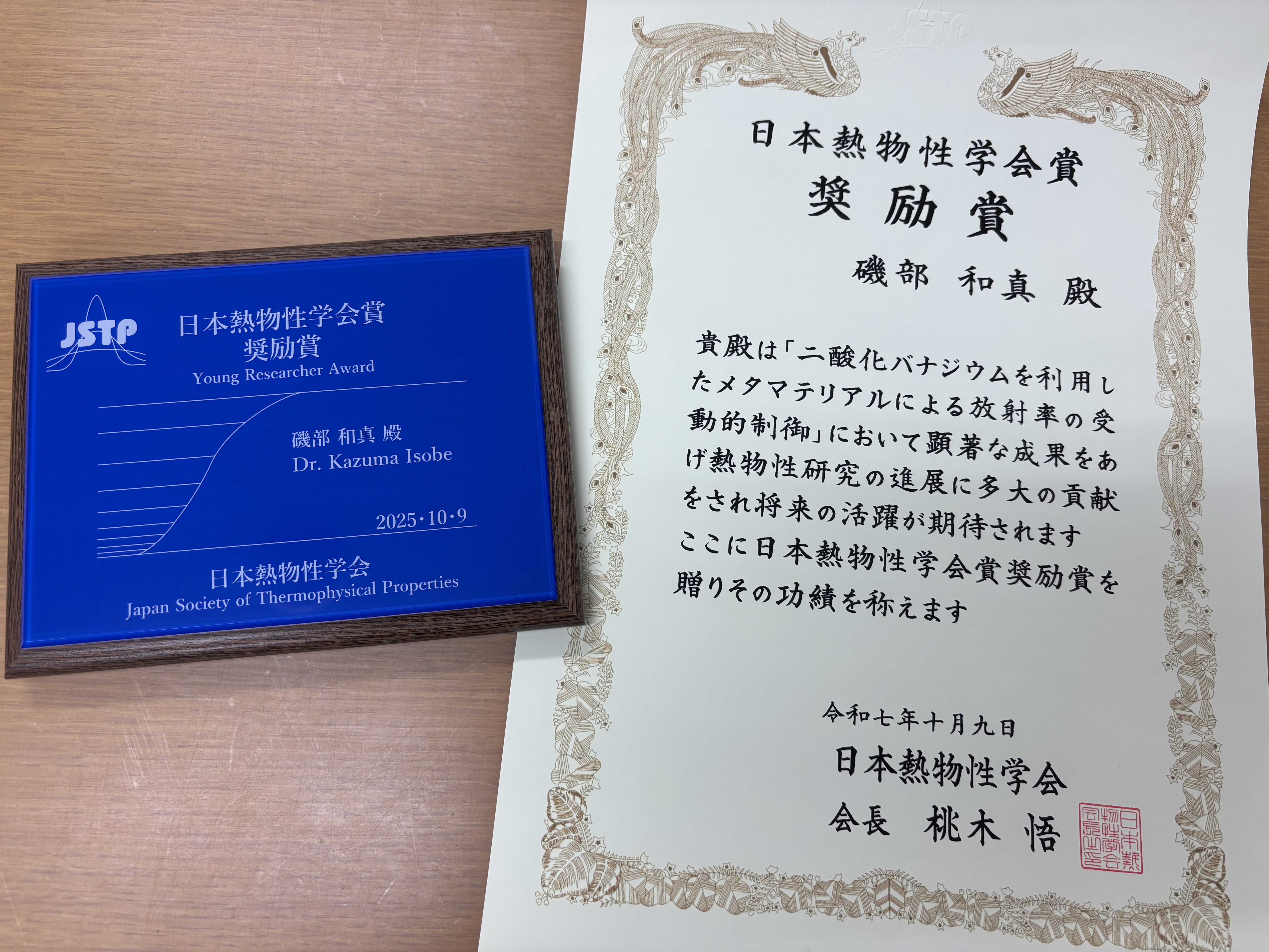 2025年10月9日に磯部和真助教が日本熱物性学会奨励賞を受賞しました.授賞式は,2025年10月8-10日に開催された第46回日本熱物性シンポジウムにて執り行われました.