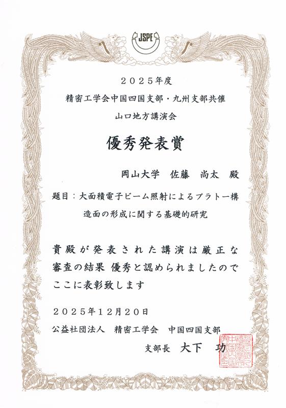 2025年12月20日にKDDI維新ホール(山口県)で開催された公益社団法人精密工学会中国四国支部・九州支部共催山口地方講演会において,佐藤尚太さんが優秀発表賞を受賞しました.