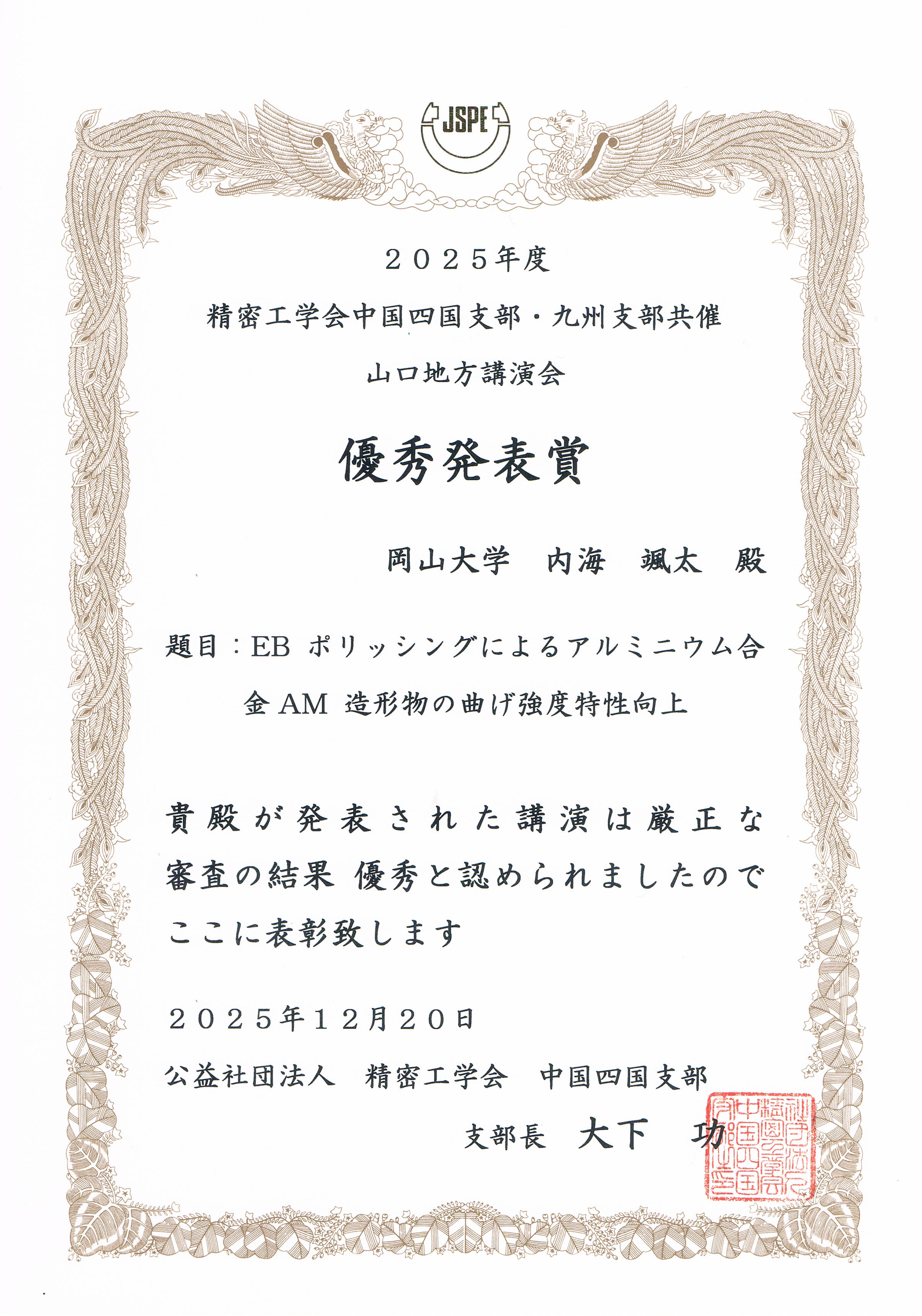 2025年12月20日にKDDI維新ホール(山口県)で開催された公益社団法人精密工学会中国四国支部・九州支部共催山口地方講演会において,内海颯太さんが優秀発表賞を受賞しました.