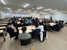 機械システム系の入学予定者61名の全員が参加して、午後の半日で入学前教育が実施されました。機械システム系の紹介の後、大学院生2名(M1・M2)より入学予定者へ向けて大学生活、研究活動、大学における勉学での心得とエールが伝えられました。2名の大学院生は、自身の経験を踏まえたわかりやすいプレゼンで、入学予定者にとっても有意義な話でした。休憩を挟んだ後、7、8人グループに分かれてTA(大学院生)1名が加わり、入学予定者同士が交流を図りました。相互の自己紹介を中心に交流を深めるとともに、連絡先を交換し合う学生もいました。その後、グルーピングを変えて交流を続け、入学予定者同士は活発にコミュニケーションを深めていました。本行事が、新入生の順調な学生生活スタートのきっかけになることを願っています。