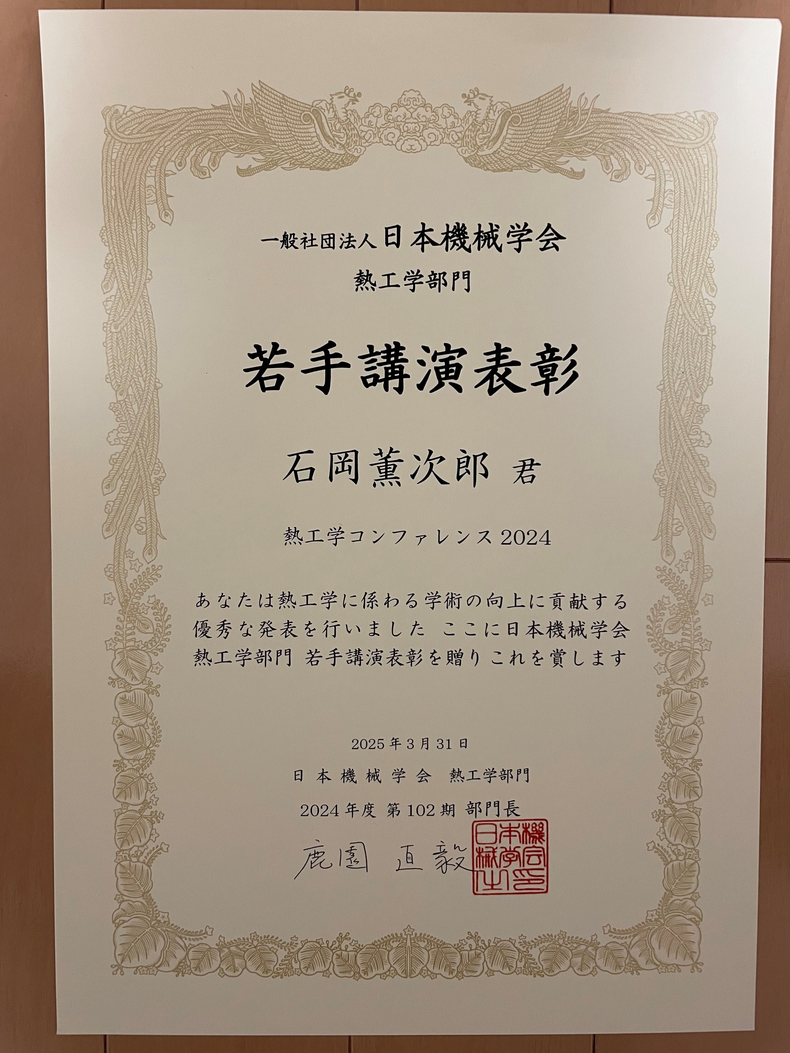 石岡薫次郎さん(2024年度修士課程修了)が,修士課程2年在学時に日本機械学会熱工学コンファレンス2024(2024年10月5日~6日)で行った講演に対して,日本機械学会熱工学部門より若手講演表彰を受賞しました.